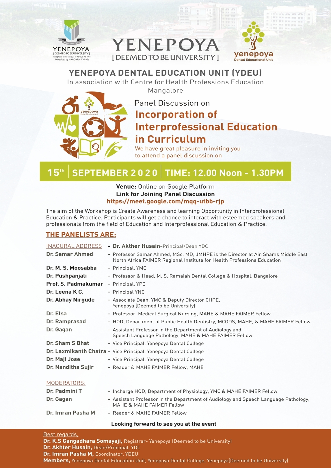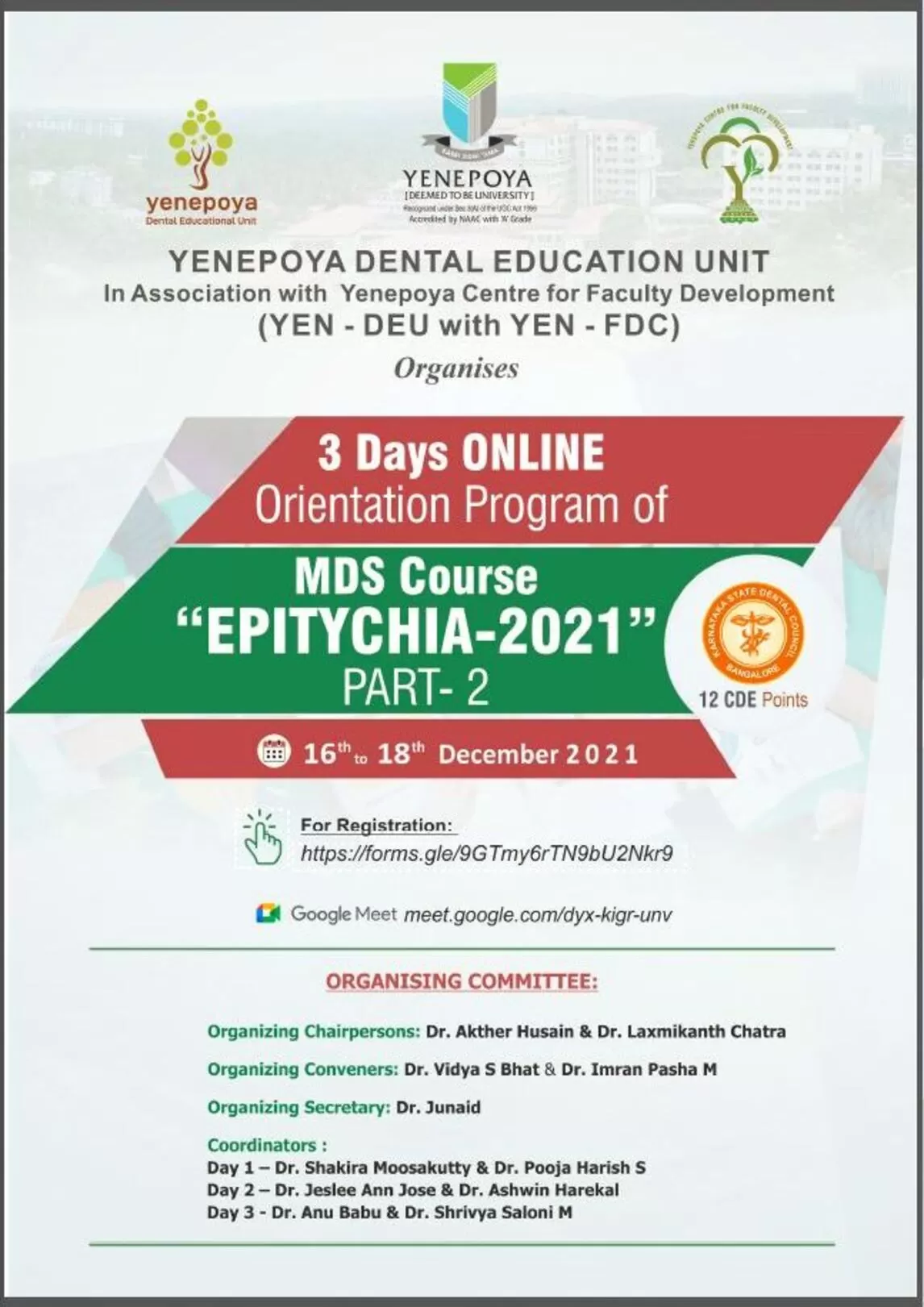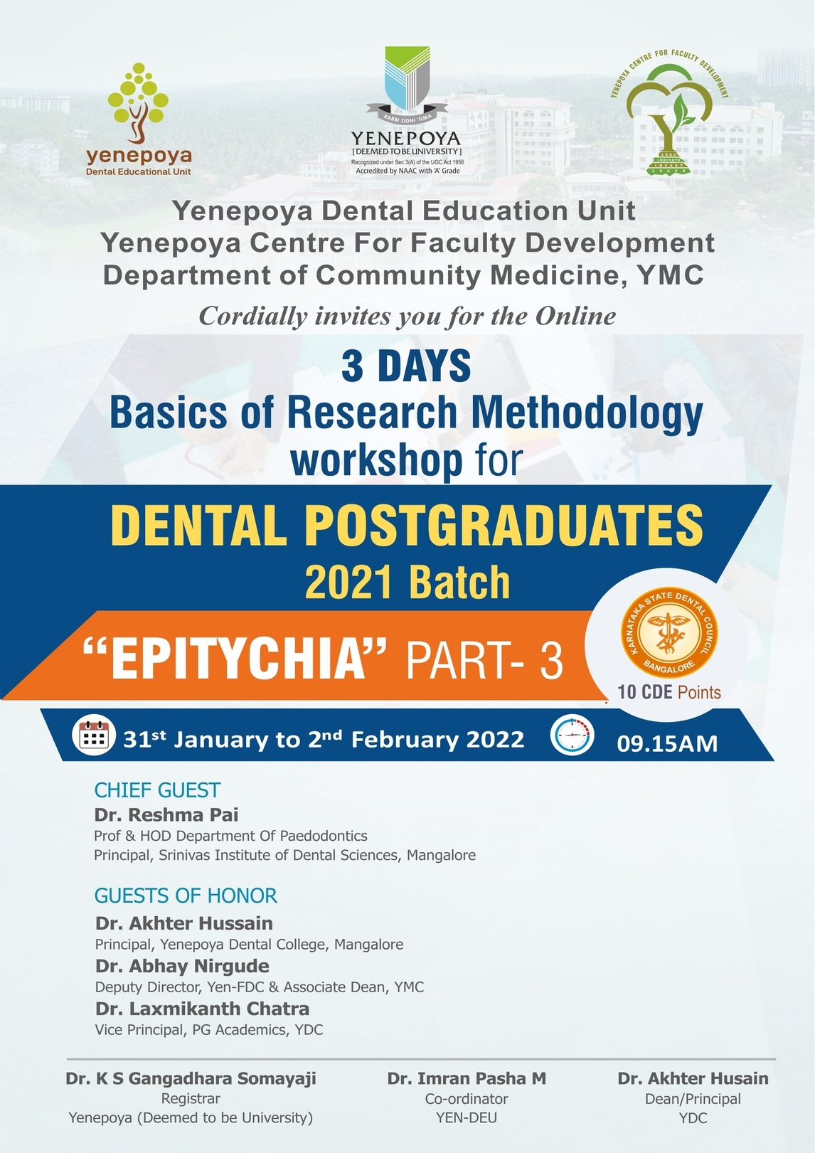The Yenepoya Dental Education Unit was established in 2020 as a part of Yenepoya Centre for Faculty Development. With Sole aim of improving teaching learning methodologies and inter professional education. The unit in association with Yen-FDC conducted International & National webinars concentrating on the faculty development. It also embarked on a journey of student development as well. The unit with an aim to bring in expertise of the international national researchers who have accomplished a lot in the medical and dental education field.